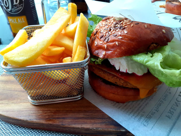 Burger in pivo fest Ob železnici Burger "z njive" s čičerikinim polpetom in pivo Old Franz Brewery